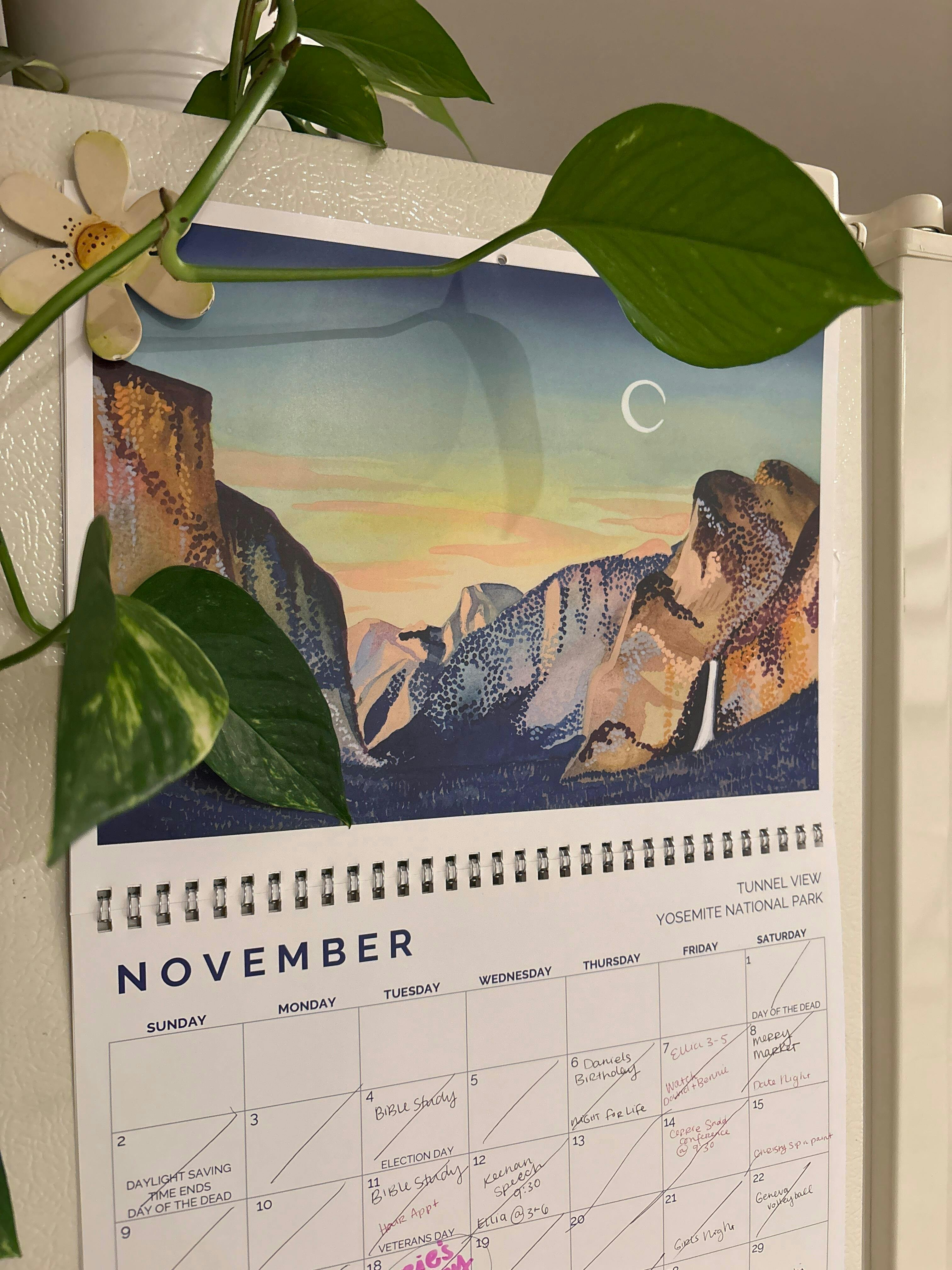 The calendar features: Redwoods, Sequoias, Joshua Tree, Glacier Point in Yosemite National Park, the Golden Gate Bridge, the Eastern Sierras, spring super blooms, Anza-Borrego State Desert, McWay Falls near Big Sur and more!