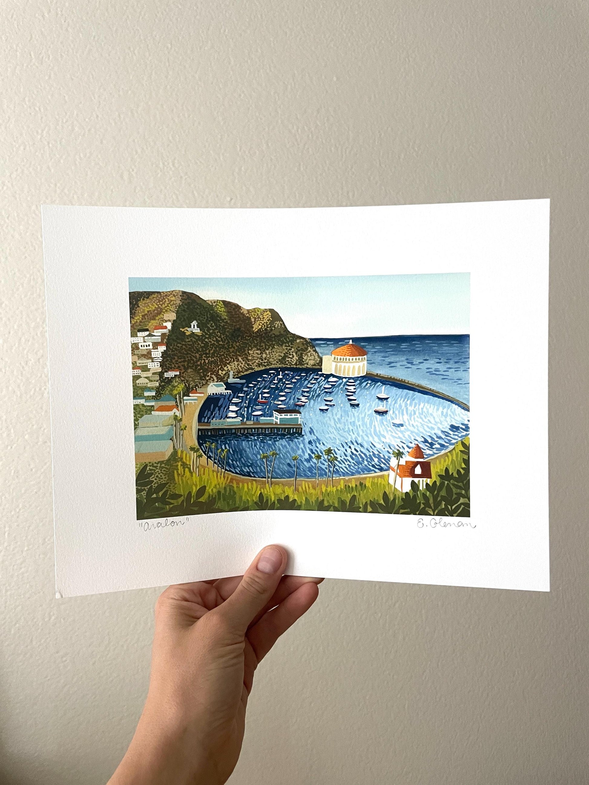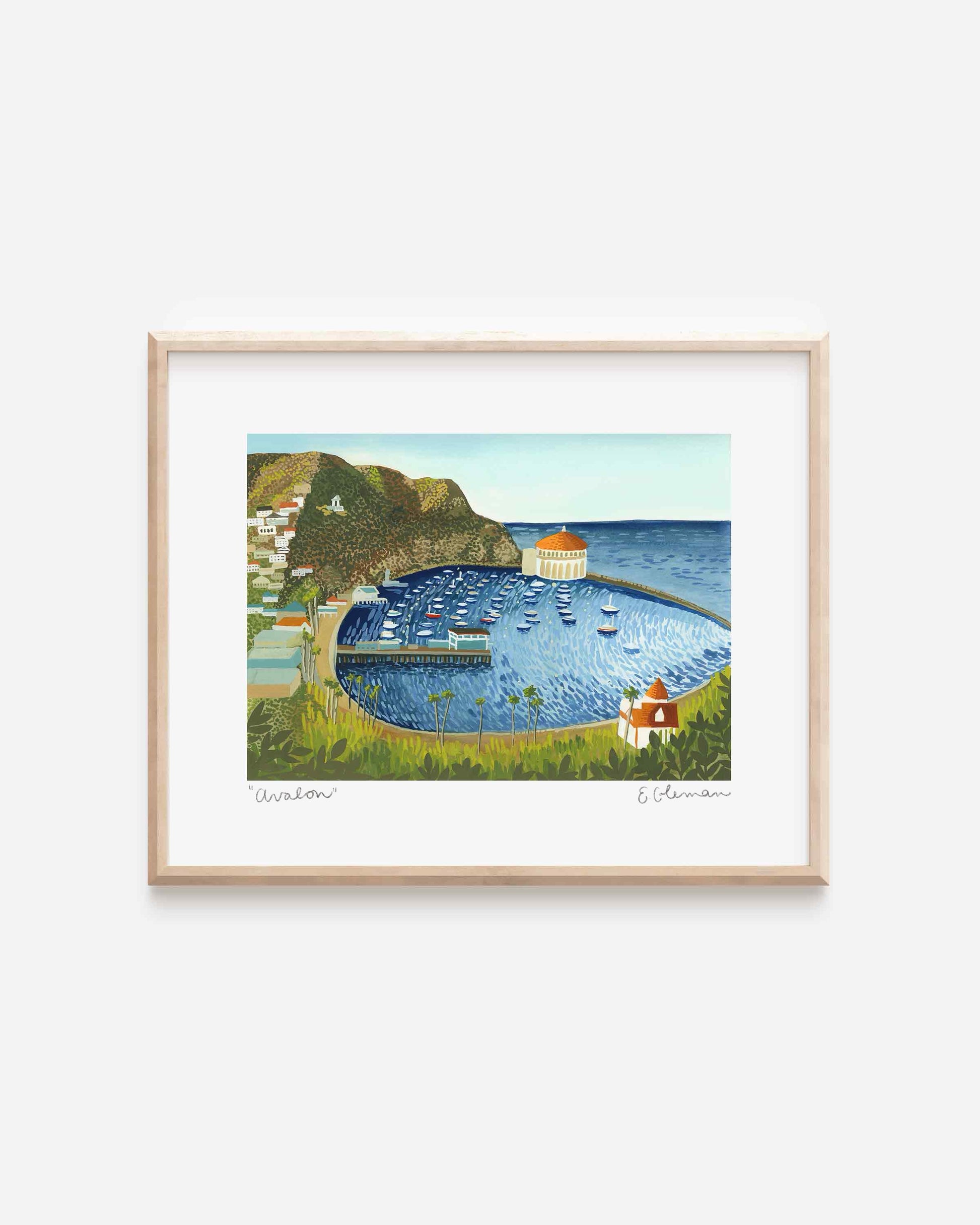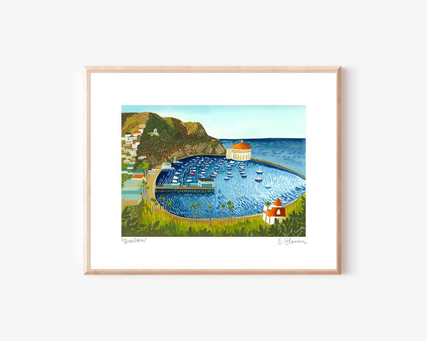 This depiction of the port at Avalon, Catalina shows one of the most popular destinations of the Channel Islands in colorful detail. Spot the Catalina Casino, homes nestled in the hills, and numerous boats and yachts harbored close to the colorful coast.