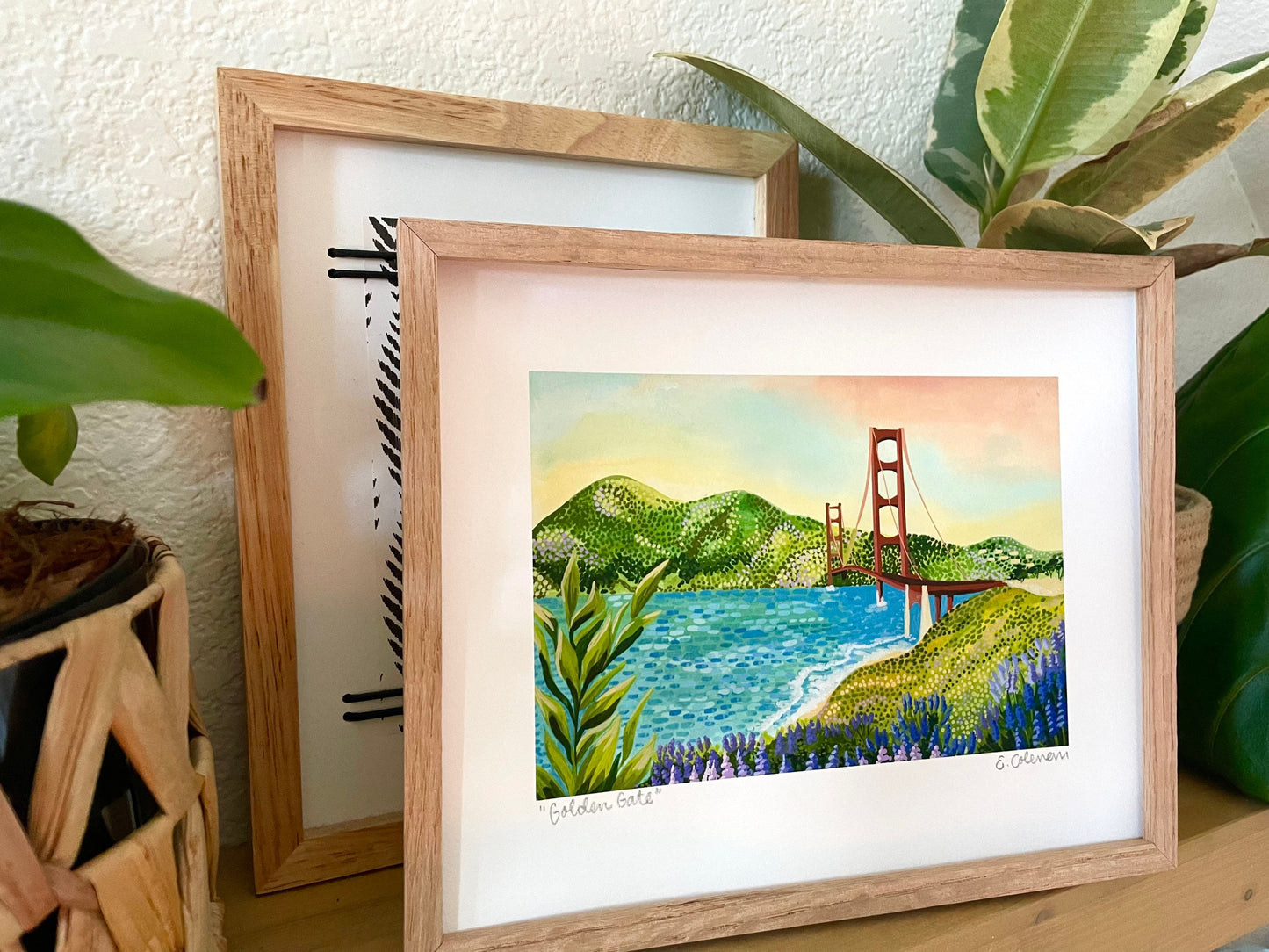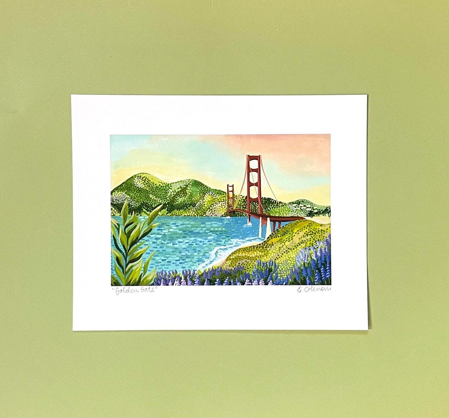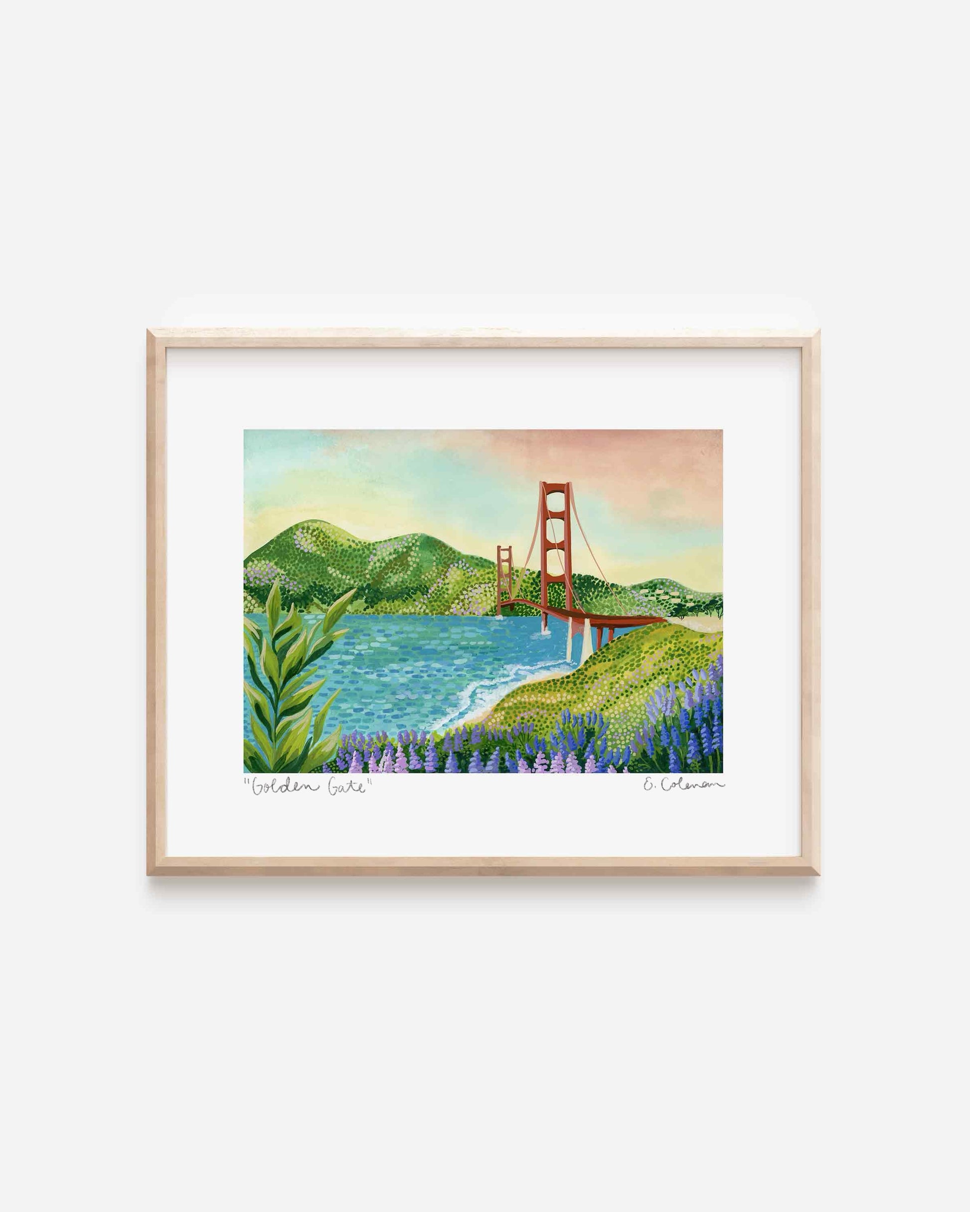 This San Francisco art print features the iconic Golden Gate Bridge, the rolling northern coast cliffs by the pacific ocean, and some of the local flora that crowds the coast. Get lost on a coastal drive with this print- it also makes a great gift!