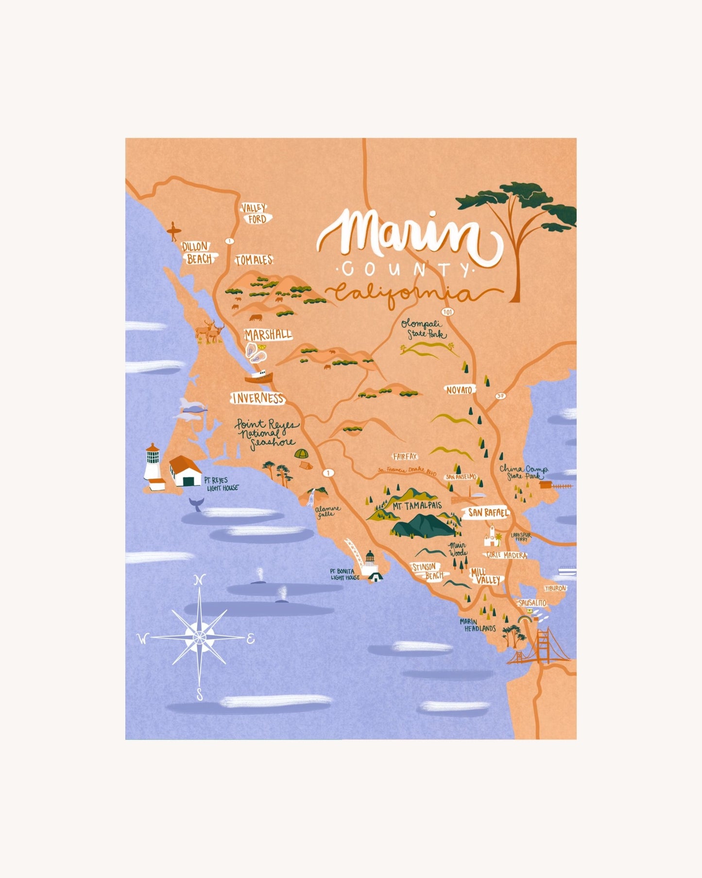 This illustrated Marin Map is a vibrant illustrated map poster of some of the bay area cities, features and landmarks of Marin County. It features towns such as Point Reyes, Sausolito, San Rafael, and Larkspur. At the bottom you can spot the beloved Robin Williams rainbow tunnell as well as the Golden Gate Bridge. Nature preserves like Mt. Tamalpais and Muir Redwoods are highlighted as well as some wildlife in the region. This poster makes a great gift or focal piece in any home.