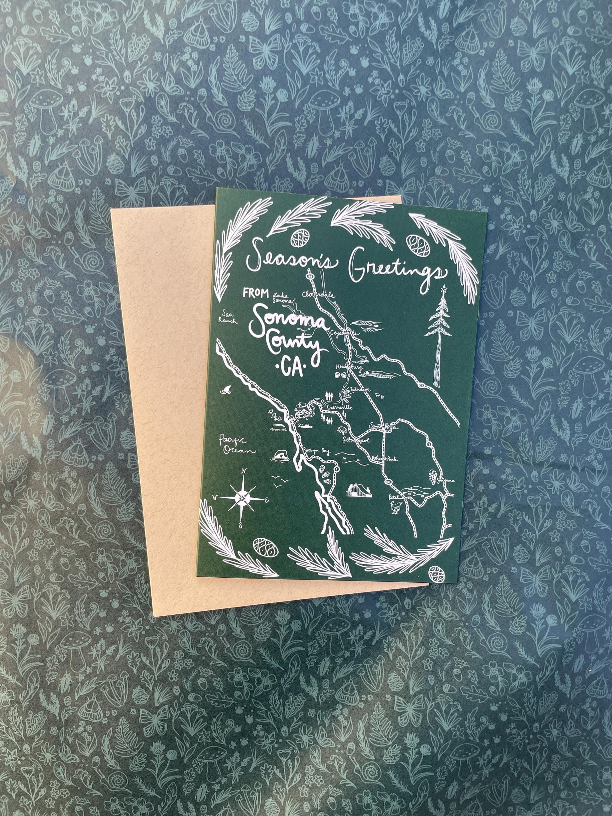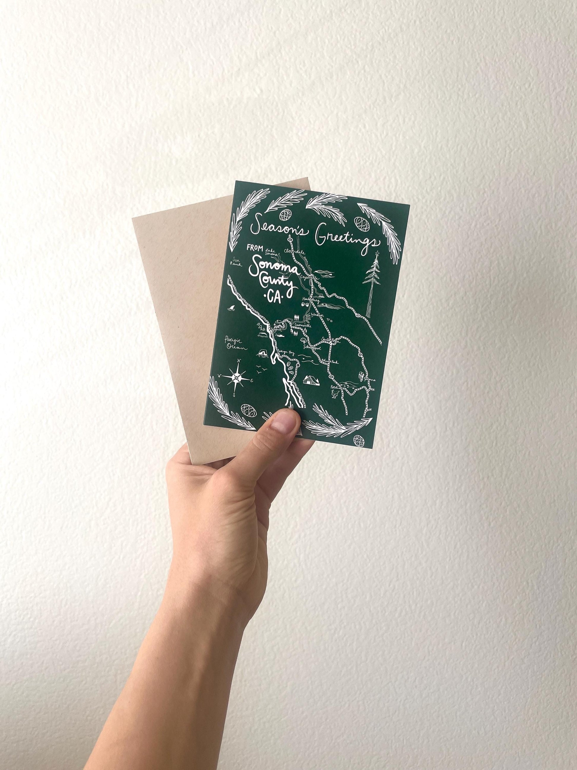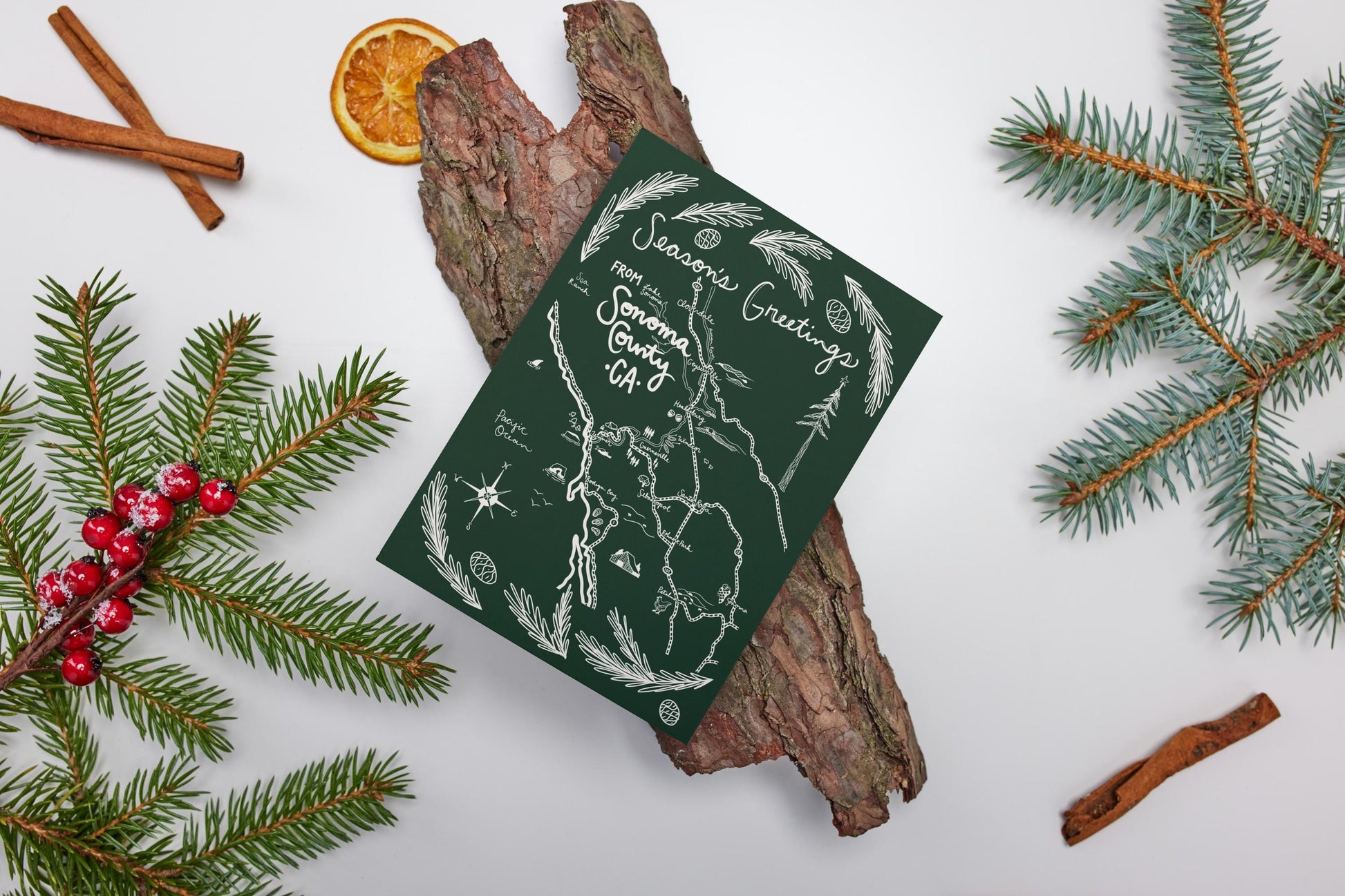 Send your season's greetings from Sonoma County with this special holiday map card. This map is hand illustrated with love to highlight the best the county has to offer: from Bodega Bay to Healdsburg wineries, from the redwoods to the Russian River, this holiday card featuring wine country's best is sure to make your loved ones want to visit.